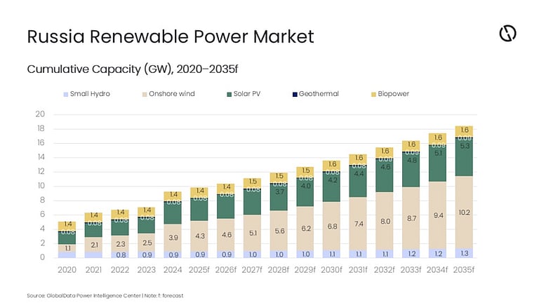 At the end of 2025, Russia’s cumulative installed renewable energy capacity had reached 9.8 GW, according to GlobalData, which expects it to further expand to 18.4 GW by 2035. This expansion, driven by onshore wind and solar PV, will entail a compound annual growth rate (CAGR) of close to 6.5% between 2025 and 2035.